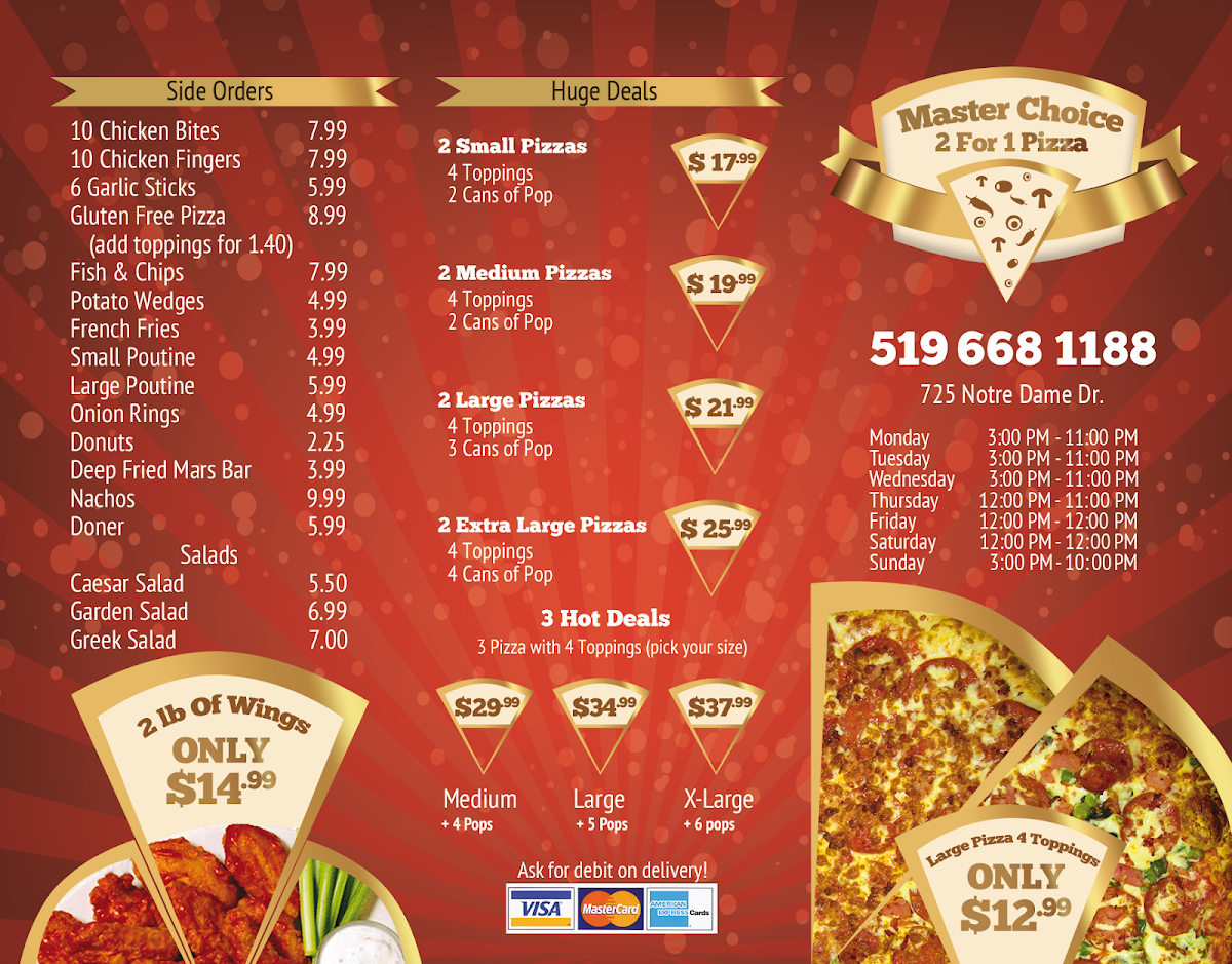 Welcome to Master Choice 2 For 1 Pizza, a hidden gem located at 725 Notre Dame Dr, London, ON. This cozy pizzeria is celebrated for its delicious, high-quality pizzas made with fresh ingredients, setting it apart from typical chain offerings.
